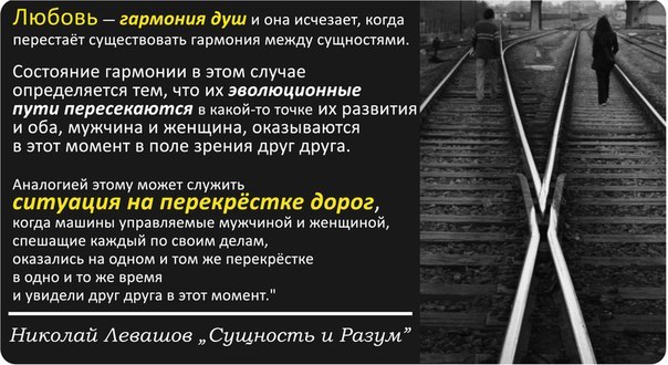 Любовь — гармония душЛюбовь — гармония душ и она исчезает, когда перестаёт существовать гармония между сущностями. Состояние гармонии в этом случае определяется тем, что их эволюционные пути пересекаются в какой-то точке их развития и оба, мужчина и женщина, оказываются в этот момент в поле зрения друг друга. Николай Левашов "Сущность и Разум" Статья с картинками находится здесь - allpravda.info. Просмотров: 3754