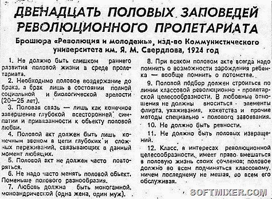 Кстати, вы заметили, что в лексиконе советского агитпропа бытовало понятие «советская женщина», но при этом отсутствовал термин «советский мужчина»? Также в печати и на плакатах постоянно встречались словосочетания «советские дети» и «советская семья». Мужчина же выступал исключительно в социально-профессиональной ипостаси – советский воин, советский рабочий и так далее. Женщина рассматривалась, прежде всего, как носительница поло-ролевой функции. Да. Она могла быть учёным, космонавтом, комбайнёром, но при этом она оставалась именно женщиной. Смотрите — в стране отмечался Международный Женский День 8 марта, тогда как мужским праздником был День Советской Армии и Военно-Морского Флота - 23 февраля. То есть даже на уровне пропаганды женщину считали, большей частью, хранительницей рода. Правда, так было не всегда. Вспомним первые послереволюционные годы! В 1920-х годах случалось много перегибов, курьёзов и даже откровенного вредительства, которое, впрочем, было завуалировано «революционной целесообразностью» или ещё каким-нибудь «сломом старого мира». Более того, в эти годы вовсю провозглашалась концепция «человека – машины», то есть организм объявлялся неким набором деталей, а любовь отныне считалась проявлением инстинктов и обычным биохимическим процессом. Всё.