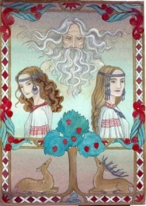 О Роде и роженицахИ вот еще какое диво посчастливилось увидеть юному миру. Земля и Небо так сильно любили друг друга, что их любовь ожила как отдельное существо - и тоже, подобно им самим некогда, тотчас распалось надвое, на Любовь Женскую и Мужскую, ибо одной недостаточно - любящих всегда двое. Бог Род, Мужская Любовь, стал даровать приплод и потомство всем дышащим тварям, и Люди скоро выучились его почитать: стали делать изображения и вкладывать в свадебные заздравные чаши, на счастье и многочадие новой семье. Это Род, говорили, выращивает деревья, это он грудами мечет с небес кремневые камешки, из которых родятся упорные и сильные Люди. Это он - Свет Небесный, без которого Солнце плыло бы одиноко, как звезда в черноте. И сколько всего нареклось его именем - не перечесть: урожай, народ, родина, роды... Богиня Лада стала Женской Любовью. По ней прозвались мудрые жены, умеющие сладить семью, завести в доме лад. Великой Богине была по душе верная супружеская любовь, и мужья с женами величали друг друга почти ее именем: Лада! Ладо мое!.. Помолвку тогда называли - ладами, свадебный сговор - ладинами, Великая Лада -Дедис-Лада, Дид-Лада, как звал ее один народ, возникший из кремня, - нипочем не простила бы подобного святотатства... Она объезжала засеянные поля в зеленой одежде, благословляя будущий урожай, и шерстка ее коня отливала спелым золотом, как налитой колос. А мужчины и женщины, держась за руки, шли вслед за нею в поля, где можно обняться вдали от чужих глаз. Люди ведали: их любовь дает добрую силу Ладу еще называли Рожаницей, в честь родящего поля и молодых матерей, которых она незримо обвивала своим поясом, помогая разрешиться от бремени. - Под какой звездой был зачат? А под какой родился? Что тут добавить? Нельзя наново родиться, переменить ту льняную нить, пряденую нитку Судьбы, которой повили когда-то пуповину младенца, накрепко привязав его к Доле... Много тех, кто, отчаявшись, живет как придется и больше не пробует что-нибудь изменить. Но еще больше иных, не скоро сдающихся, кто однажды поймал свою нерадивую Долю за шиворот и запер в погреб, чтобы не мешала. А то, оттрепав за уши, вразумил косорукую тонко прясть и мелко молоть, заставил лежебоку вскакивать до свету и не жалеть плеч! ...А еще у великой Лады, у матери-Лады была юная дочь. Звали ее просто Доченька - Леля, Лелюшка, Полелюшка. Недаром любимое детище до сих пор не просто растят - лелеют, колыбель зовут люлькой, а само дитя нет-нет да покличут нежно лялечкой. И ласка, и оберег именем прекрасной Богини. Подросла Леля и стала гулять по лугам, по густым тенистым лесам, и шелковая мурава сама льнула ей под ноги, чтобы распрямиться еще зеленее и гуще. А минуло время - начала Леля вместе с матерью обходить и объезжать поля, тянуть за зеленые ушки едва проклюнувшиеся всходы, и Люди увидели, что никогда прежде не было на Земле таких урожаев. Стали они славить Лелю наравне с матерью и чтить как Рожаницу, называть Весной-кормилицей. У Лады стали просить разрешения закликать-зазывать в гости Весну, а когда Мать позволяла - готовили Дочери дерновую скамью, проросшую травами, ставили подношения: хлеб, сыр, молоко. Это был девичий праздник, мужчин,любопытных парней близко не подпускали. Жгли в честь Матери с Дочерью огромный костер, окруженный двенадцатью другими, поменьше, в честь Месяцев, и с пеплом того костра с