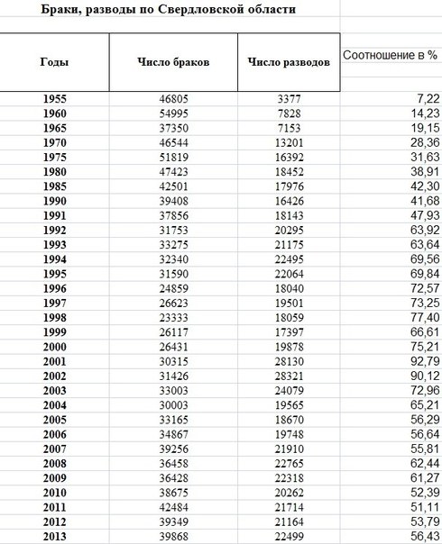 Размышления по статистике заключенных и расторгнутых браков по Свердловской областиДинамика за последние 3 года (2011-2013 гг.) статистических данных стремится к соотношению 60% относительно заключенных и расторгнутых браков, в пользу вторых. И это только официальные данные. Предполагаю, и не без оснований, что есть и супруги, которые не подают на развод, живя раздельно несколько месяцев, или даже годами. Таких останавливает нежелание друг друга видеть, сложные для них бюрократические процедуры подачи документов и их рассмотрения, в том числе и из-за низкого уровня правосознания. Есть и те мужчины, которые терпят свое бесправное положение в браке из-за боязни общественного осуждения, запятнать свою репутацию, потерять определенное положение на работе (на некоторых работах могут не повысить по службе, если мужчина не женат или в разводе), из-за потери детей и отстранения от их воспитания, и в особо редчайших случаях, отлучения мужчины от материальных ресурсов. Не исключаю случаи воздержания расторжения брака со стороны женщины, но лишь по причине боязни потери источника(ов) материальных ресурсов. А есть и те мужчины и женщины, у которых подавлена своя воля к принятию решения о расторжении брака. Среди прочих, есть и заключенные фиктивные браки, в том числе с целью скрыть свое половое извращение (сознательно не пишу про половую ориентацию, которая является половым извращением), усыновления ребенка, браки "звёзд" между собой для повышения своей популярности, цыганские схемы отъема недвижимости у одиноких мужчин путем спаивания до могилы и другие. А если супруг (супруга) умер в этот год, то брак считается автоматически прекращенным, но не расторгнутым, что означает, что он в официальную статистику не попадает. Поскольку эта статистика не учитывает подобную статистику по административному центру субъекта, будет справедливо увеличить цифры официальной статистики на несколько единиц или даже десятков единиц. Данная удручающая картина иной раз доказывает, что брак является причиной развода, и он не ведет к созданию или укреплению семьи. Размеры государственной пошлины не остановят процессы расторжения браков. Привожу размеры государственной пошлины: В соответствии с п. 5 ч. 1 ст. 333.19. Налогового кодекса РФ размер государственной пошлины по делам, рассматриваемым судами общей юрисдикции при подаче искового заявления о расторжении брака составляет 600 рублей. С 01.01.2015 года в соответствии с ч. 1. ст. 333.26. Налогового кодекса РФ, размеры государственной пошлины за государственную регистрацию актов гражданского состояния и другие юридически значимые действия, совершаемые органами записи актов гражданского состояния и иными уполномоченными органами будут такими: 1) за государственную регистрацию заключения брака, включая выдачу свидетельства, - 350 рублей; 2) за государственную регистрацию расторжения брака, включая выдачу свидетельств: при взаимном согласии супругов, не имеющих общих несовершеннолетних детей, - 650 рублей с каждого из супругов; при расторжении брака в судебном порядке - 650 рублей с каждого из супругов; при расторжении брака по заявлению одного из супругов в случае, если другой супруг признан судом безвестно отсутствующим, недееспособным или осужденным за совершение преступления к лишению свободы на срок свыше трех лет, - 350 р