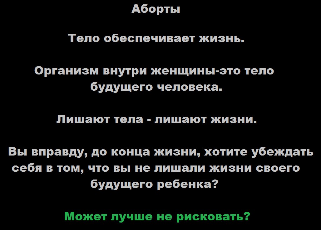 Во имя нерождённыхЧеловек способен привыкнуть ко всему и поверить во что угодно. Глаз привыкает к ужасу, и в искаженном мире многие находит своё место. Сплетая свой самообман, они стремятся сохранить своё место несмотря ни на что. Но однажды реальность ломает иллюзии, подводя трагичный итог прожитой жизни. И потому всегда нужно трезво взирать на мир. А поглядеть есть на что. Если человек не хочет видеть, он будет слеп. Следующий текст будет бесполезен для тех, кого он касается прямо, кому их место важнее, чем судьбы других людей, пускай и нерождённых. АбортыТут не будет фото или видео, изображающих всю мерзость этого явления. Если человек зайдет в больницу, и выключит у кого-либо аппарат жизнеобеспечения, это будет считаться убийством. Если человек лишит другого человека доступа к лекарствам, это будет считаться убийством. Убийца в таком случае не совершает убийство прямо, но его действия становится причиной смерти. Когда один человек создает для другого условия, в которых невозможно выжить, он , фактически, совершает убийство. Но вот давайте представим себе ситуацию, когда кто-то лишит другого человека не возможности выжить, а возможности родиться. И в том и в том случае результат один, человека нет. Только останки. Так в чём разница? А разница то есть В случае, когда человек погиб, он уже прожил часть жизни. Даже если умер младенец, он уже прожил несколько дней. Нам всем жалко погибших детей. “Как мало они прожили” -говорим мы.