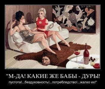 Женщины в современном обществеИзвестная пословица гласит: «Хочешь уничтожить народ — разврати его женщин». Возможно, многие вновь не согласятся, что русский народ день за днём упорно и безжалостно уничтожают, но с тем, что российские девушки оставляют желать лучшего, не поспорит практически никто!.. В чём же причина такого вульгарного поведения женской половины населения? Причин много, но объединяет их всё тот же проклятый геноцид. Попробую разложить всё, так сказать, по полочкам... Не вижу смысла затрагивать в данной статье вредные привычки, потому что им одинаково подвержены как мужчины, так и женщины. Аналогичная ситуация с ночными клубами. Ботокс и силикон также оставим в стороне. В нашем случае имеют место быть гораздо более опасные и изощрённые методы уничтожения прекрасного пола. Представляю вашему вниманию список самых опасных предметов, окружающих любую женщину на протяжении всей её жизни: 1) Туфли на шпильках. Да, вы не ослышались, простые шпильки на самом деле являются смертоносным оружием!!! Основная их беда заключается в том, что каждый сантиметр каблука пагубно сказывается на позвоночнике, а нагрузка на переднюю часть стопы увеличивается в шесть раз! Как результат, в старости вам обеспечены радикулит, деформация ног, натоптыши, артрит, варикоз, судороги и боли в пояснице! И это отнюдь не исчерпывающий перечень! Вам оно надо? Уверен, что нет! Да и вообще, милые дамы, взгляните на себя со стороны! Как же вы до сих пор не заметили (а может и заметили, Я ведь многого не знаю), что женские ноги в туфлях на шпильках напоминают коровьи копыта! Не разделяете мою точку зрения? Напрасно... Повторяю, присмотритесь! Даже особой фантазии не надо для того, чтобы это увидеть! Поэтому, дорогие девушки! Призываю вас — выбросите эти чёртовы туфли, которые медленно, но верно убивают вас! Выбросите безо всякого сожаления! Ведь в мире столько удобной обуви: кеды, балетки, сандалии, сланцы! Любые формы, размеры и цвета! Ходите без каблуков и будьте здоровы! 2) Косметика. Какой только косметики нет в арсенале современной женщины! И лаки, и тушь, и пудра, и помады разных оттенков! А от всевозможных кремов и бальзамов просто глаза разбегаются! Но какова будет ваша реакция, если Я сообщу, что нанося эти «чудо-препараты» на свою кожу, вы обрекаете её на неминуемую гибель? Страшно? Сейчас будет ещё страшнее! После использования любой(!) косметики кожа начинает медленно стареть! Иммунитет уверенно снижается, а головная боль становится вашим постоянным спутником! Аллергия, покраснения, даже рак — всё это может ожидать вас, если вы не прекратите «дружить» с косметикой! Не надо лихорадочно искать причины ваших недомоганий, запомните раз и навсегда — все «виновники торжества» находятся внутри косметички! Следовательно, отправляем её вместе с содержимым следом за шпильками, а в голове держим мысль о том, что нет ничего прекрасней естественной красоты!.. 3) Одежда. Сразу хочу отметить, что не вся одежда пагубно влияет на женский организм! Речь пойдёт о стрингах, узких джинсах, коротких юбках и топиках. Любая короткая и открытая одежда обеспечивает прямую дорогу на больничную койку! Девушки ведь не задумываются о том, сколько всякой заразы летает в воздухе и просачивается прямиком в их половые органы, благодаря всем этим «модным» предметам гардероба. И это только в 